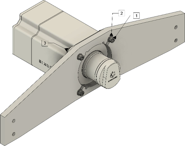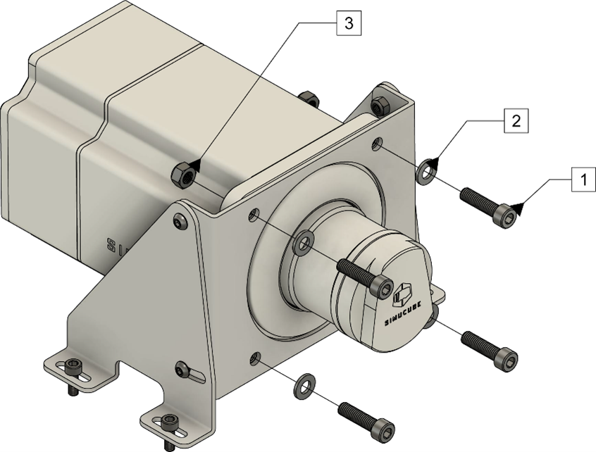 Mount Simucube 2 as shown in above figure. Sport and Pro models are mounted with 30mm M8 bolts with 1.25mm thread pitch (1) and M8 flat washers (2). Simucube 2 Ultimate is mounted through-the motor flange with bolts (1), washers (2) and a M8 locking nuts (3).