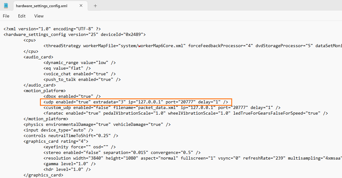 - Change the line to: \<udp enabled="true" extradata="3" ip="127.0.0.1" port="20777" delay="1" />