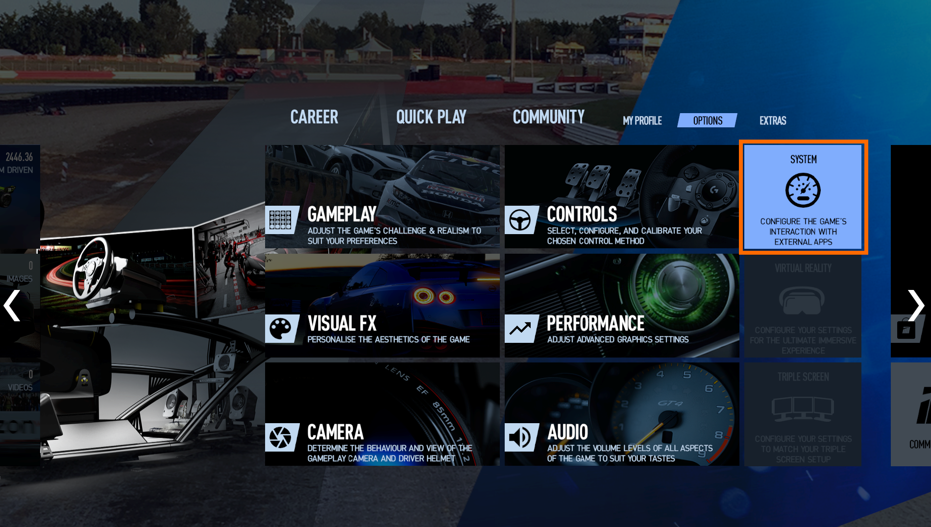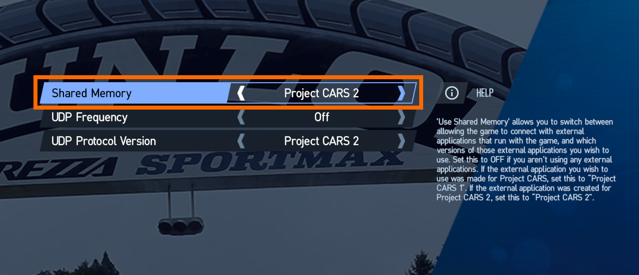 Project CARS 2¶ Setup¶ Navigate to OPTIONS Select SYSTEM Set Shared Memory setting to "Project CARS 2"