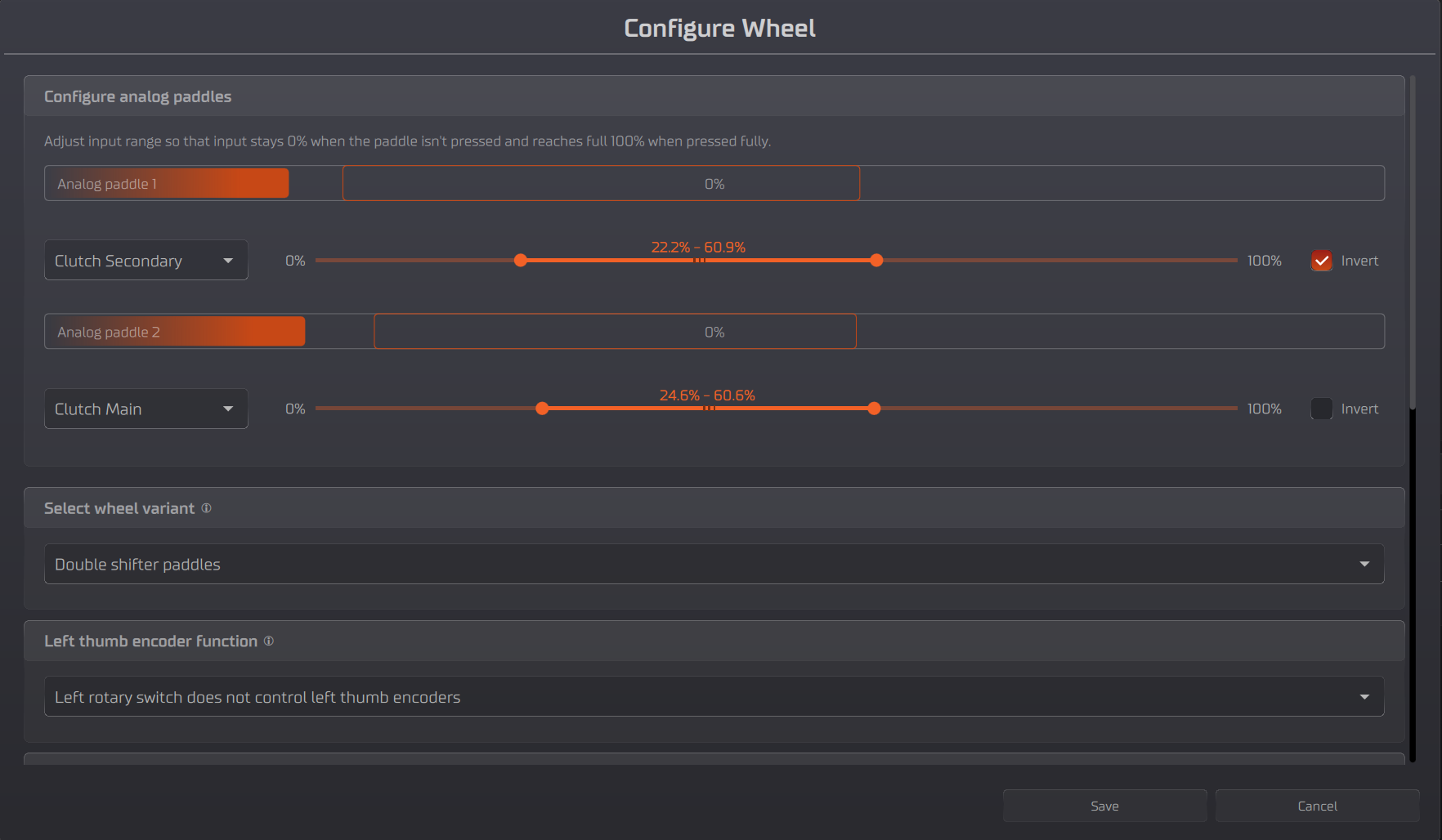 - Follow the instructions on the screen and adjust the maximum and minimum values of the analog paddles so that in the end the resting position the output is 0% and when the paddle is fully pressed the output is 100%