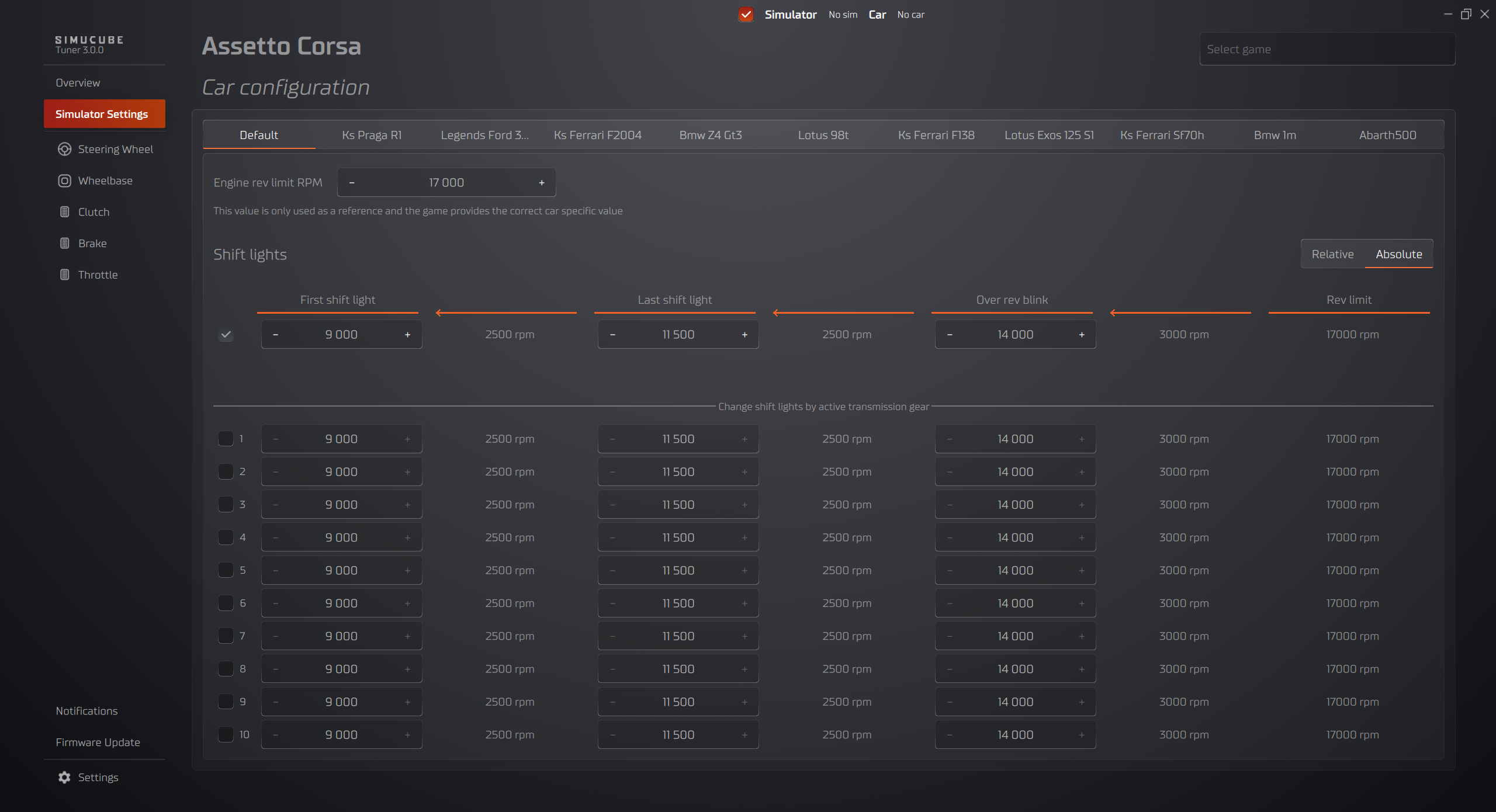 - If the game you are playing offers the car rpm range through the telemetry, the RPM values are ignored and cannot be adjusted. To adjust the RPM range, you need to unselect the Use car specific profile checkbox and adjust values in the Default car profile.