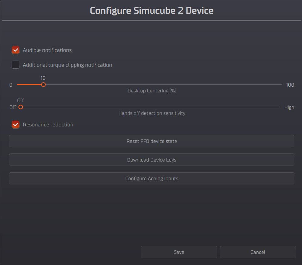 This setting allows to make the device give an audible notification whenever maximum torque is requested. This is useful to detect clipping (torque saturation) in simulators that do not have a visible in-simulator indicator for torque clipping. Typically clipping is to be avoided in normal driving conditions, and if you experience clipping, the in-simulator torque should be reduced and the maximum strength in FFB settings increased.